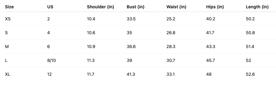 | Size | US | Shoulder | Bust | Waist | Hips | Length |
