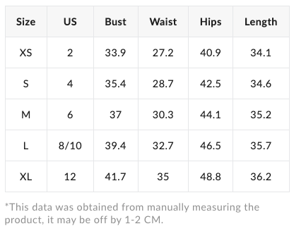 | Size | US | Bust | Waist | Hips | Length |