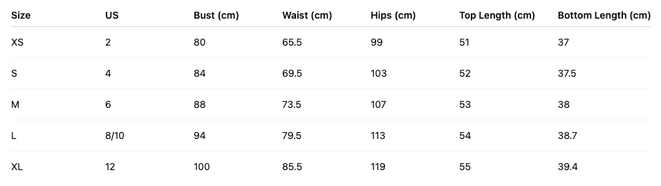 | Size | US | Bust | Waist | Hips | Top Length | Bottom Length |