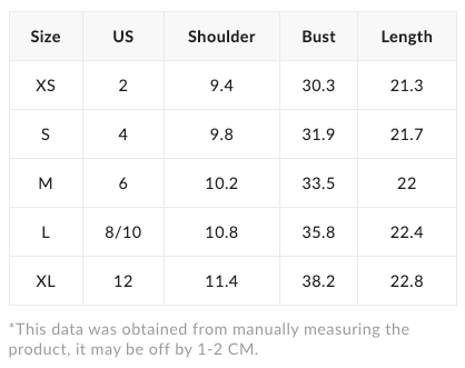 | Size | US | Shoulder | Bust | Length |