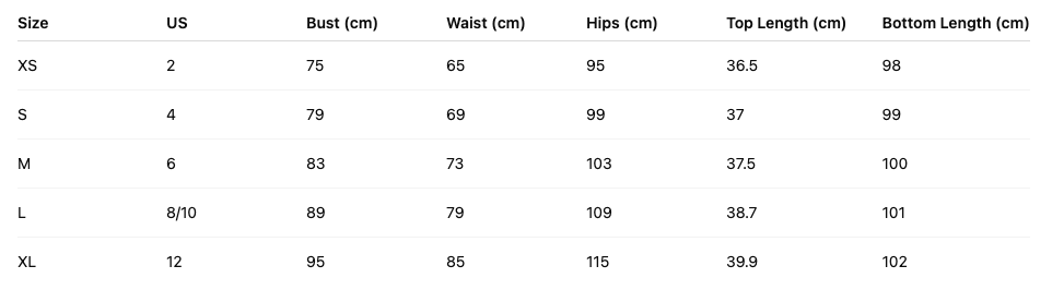 | Size | US | Bust | Waist | Hips | Top Length | Bottom Length |